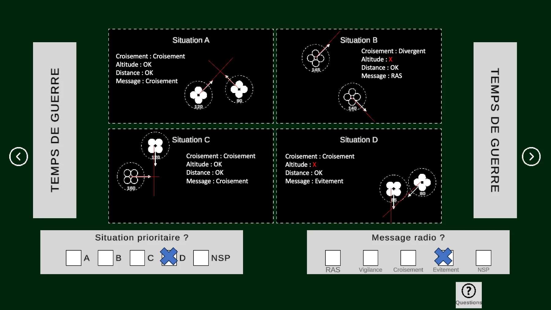 Pour le test de priorisation drone, les questions du jour j demandent un peu plus de temps de réflexion car certaines situations sont vraiment très proches (très souvent on doit choisir la situation en fonction du carburant restant) mais les directions lors de croisements de drones sont beaucoup plus nettes que sur le site ou il y a des ambiguïtés.