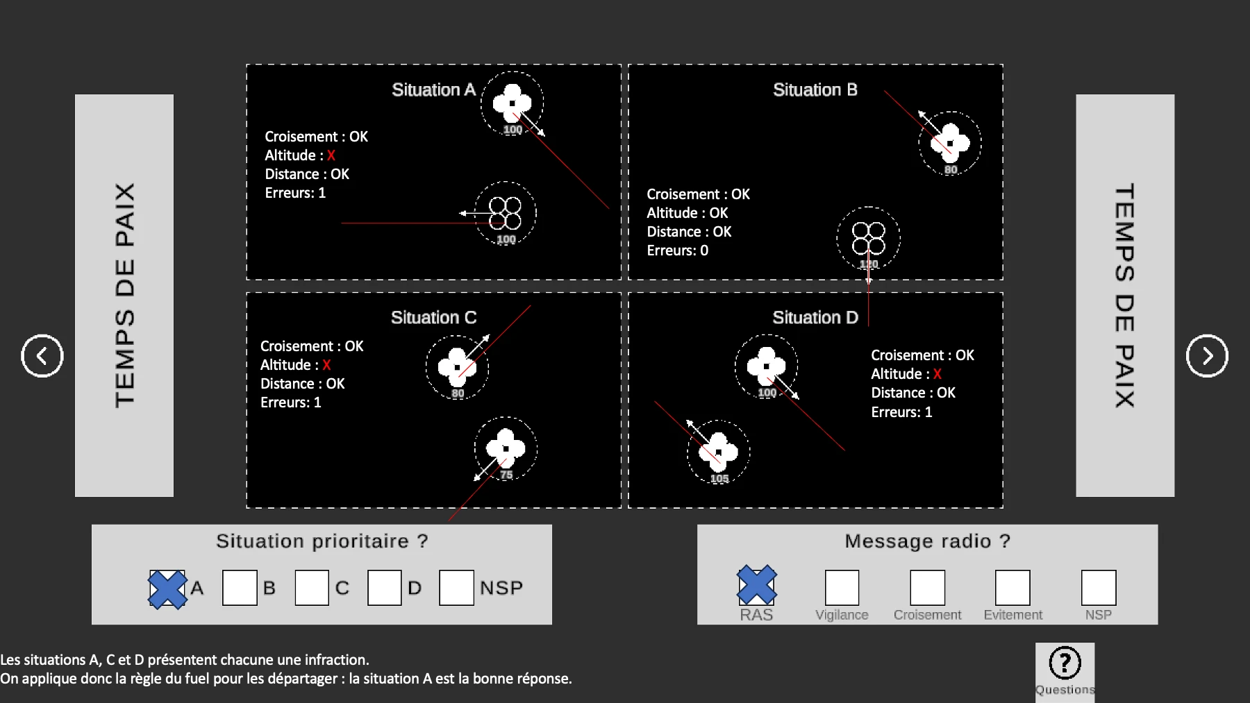 Pour le test de priorisation drone, les questions du jour j demandent un peu plus de temps de réflexion car certaines situations sont vraiment très proches (très souvent on doit choisir la situation en fonction du carburant restant) mais les directions lors de croisements de drones sont beaucoup plus nettes que sur le site ou il y a des ambiguïtés.